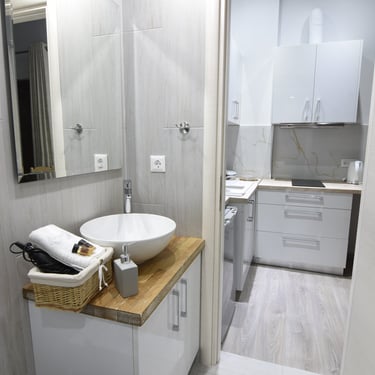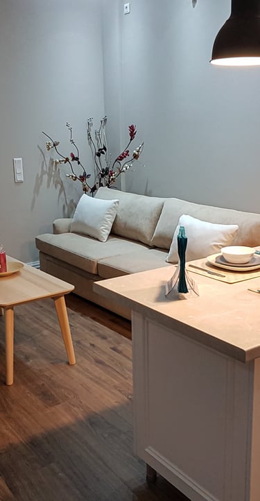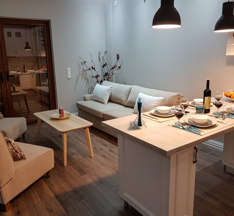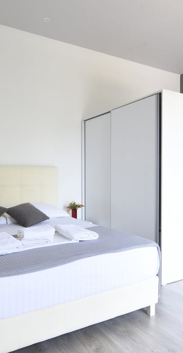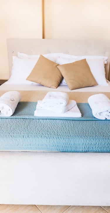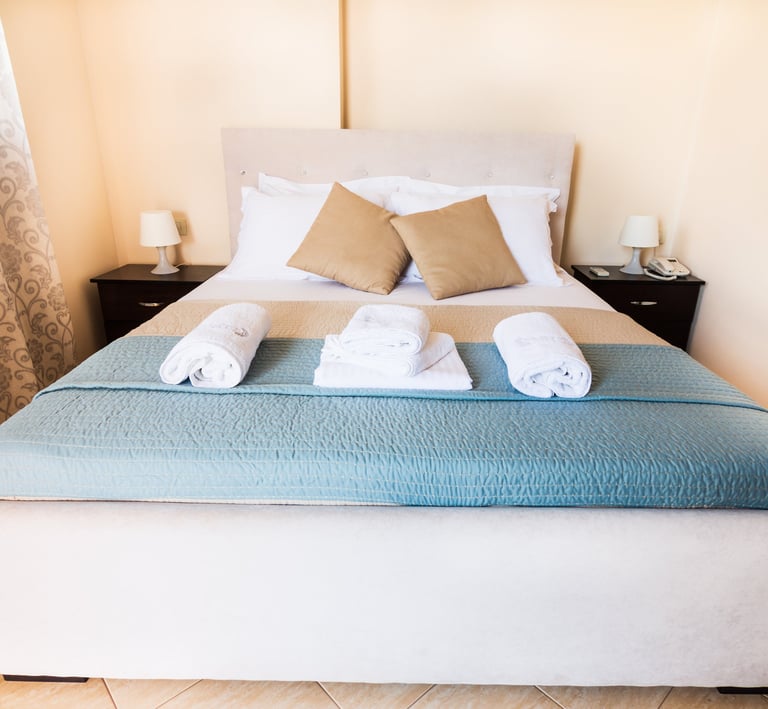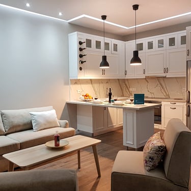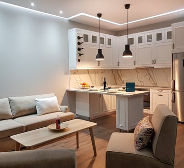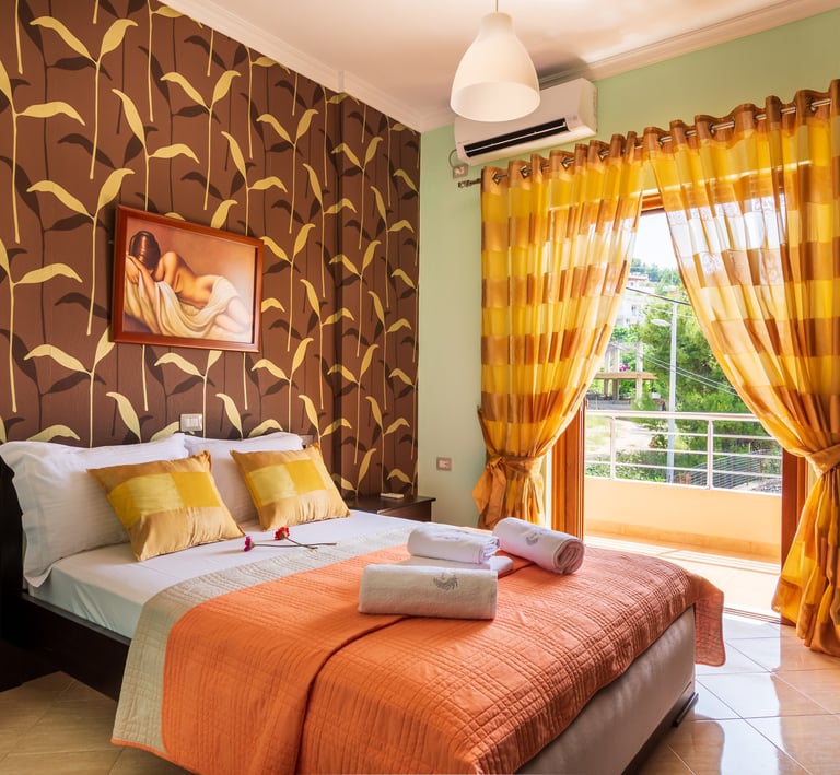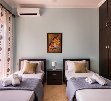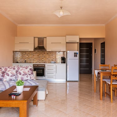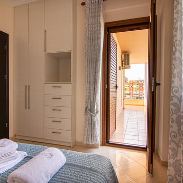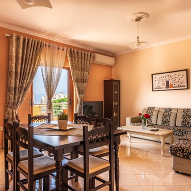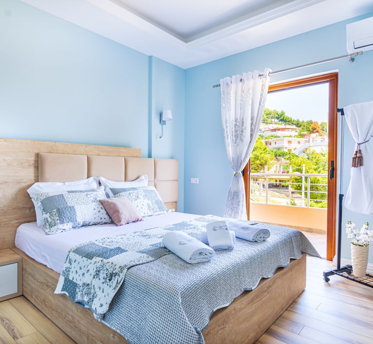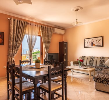 A comfortable suite centered around a king‑size bed and a separate lounge area with a sofa bed. This unit includes a private bathroom, air conditioning, kitchenette facilities, and a balcony, offering a relaxing retreat after a day exploring Sarandë.
