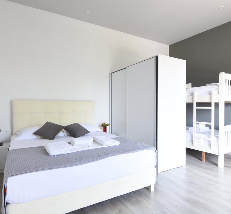 Ideal for larger groups or longer stays, this spacious apartment includes two separate bedrooms, a living area with a sofa bed, a private bathroom, and a fully equipped kitchenette.